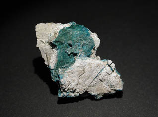 | 滋賀県 石部町にある採石場の一部に現れたスカルンの酸化帯から産出した、銅、亜鉛の含水燐酸塩鉱物、ベゼリ石です。色は鮮青色のものから、濃緑色のものまでありますが、今回のものは濃緑色のもので、ほとんどは皮膜状ですが、一部に微小な自形結晶が見られるものもあります。 |