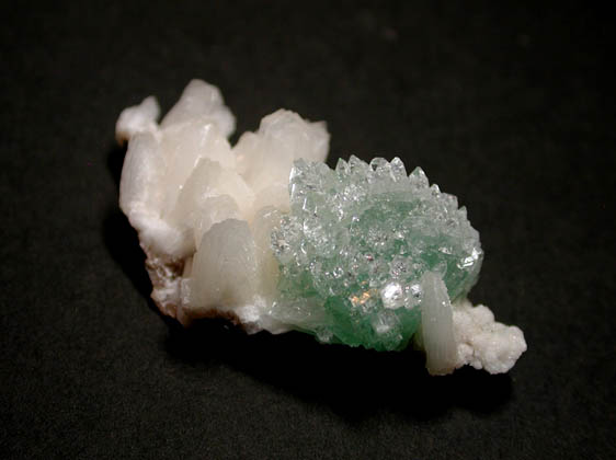 | 束沸石上にグリーンの犬牙状結晶が集合体をなして産出した、インド産のグリーンアポフィライトです。 |