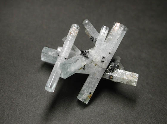 | ナミビア、エロンゴ産のアクアマリンです。六角柱状結晶が組合わさって、魅力的な外観となっている良標本で、黒色の鉄電気石を共なっています。 |