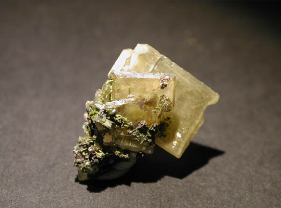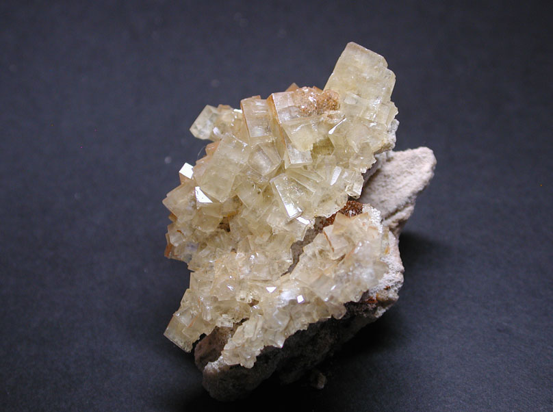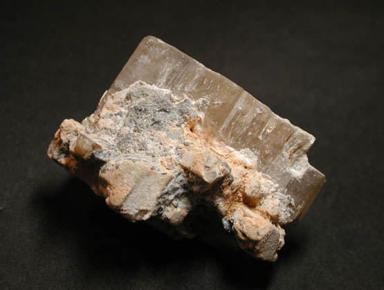 イタリア、サルディニア産の古典的有名標本、フォスゲン鉱です。鉛、炭酸基、塩素という組成を持った稀産鉱物ですが、ヨーロッパでの人気は非常に高く、鉱物コレクションには必須の品となっています。重量感のあるベージュ色、半透明の結晶標本となっています