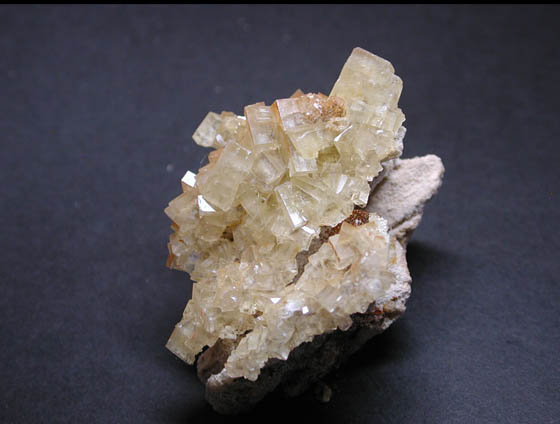 フランス産の黄色い重晶石です。透明感のある菱形結晶の集合体となっています。