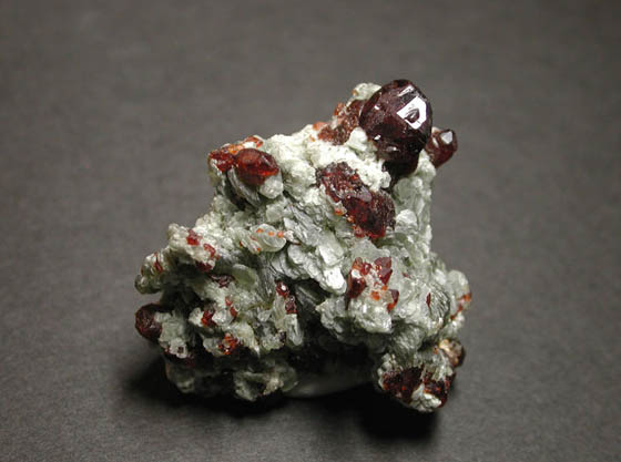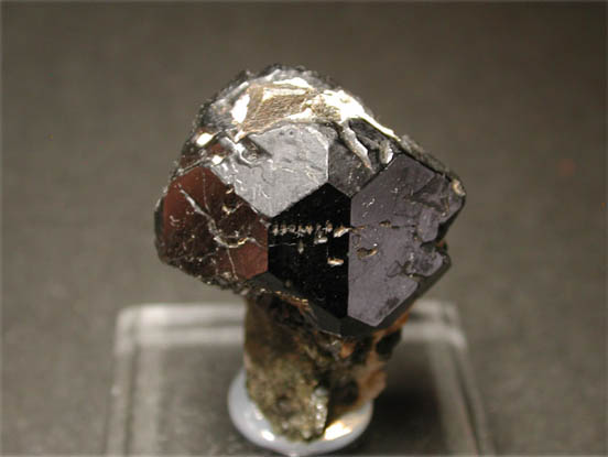 マグネシウムと鉄にフッ素を加えた珪酸塩鉱物、コンドロ石です。一般的には同じグループのヒューム石などと同様に微小なオレンジ色の結晶で産出しますが、このアフガニスタン産の標本は、暗赤色をした立派な自形結晶で産出する高品質な標本です。