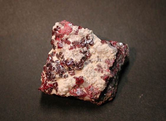 ウクライナ(ロシア) Nikitovka産の辰砂です。輝安鉱や硫砒鉄鉱などと共に産出する、鮮赤色が美しい結晶標本です。標本の一部には貫入双晶も見られます。