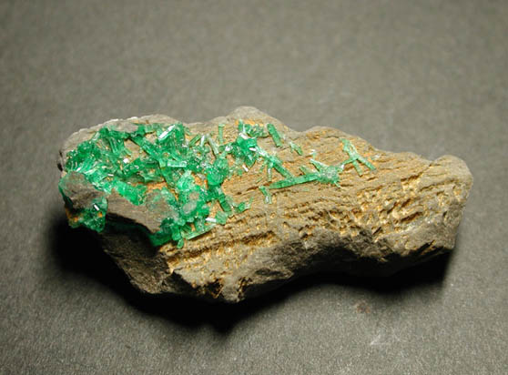 | コロンビア、ムソー産 エメラルドの珍品です。ムソー産には珍しい産状で、鮮やかなエメラルドグリーンの細柱状結晶がたくさん付いています。 |