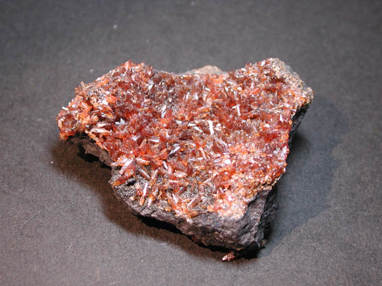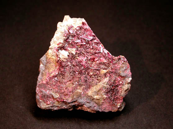 | コバルトの含水砒酸塩鉱物、コバルト華です。末端が斜めに切れた、ローズピンクの板状結晶が母岩全体に密集しています。 |