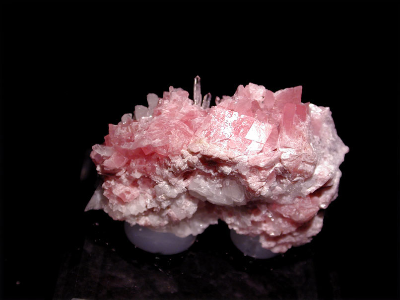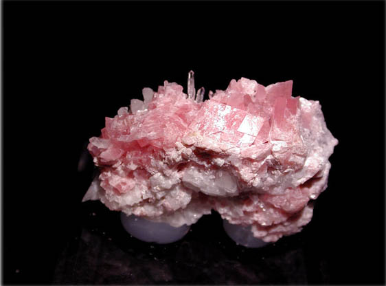 ペルー、パストブエノ産のロードクロサイトです。水晶を共ない、ピンク色の菱面結晶の集合体となっています。