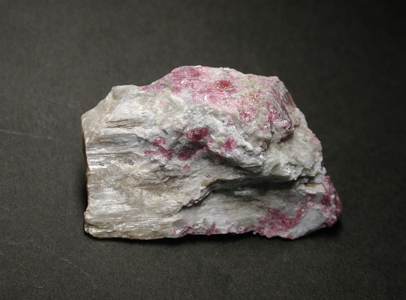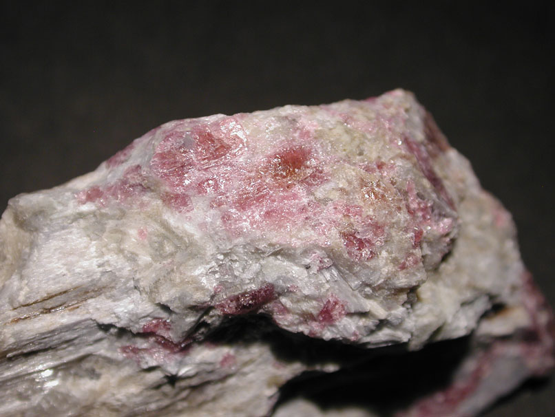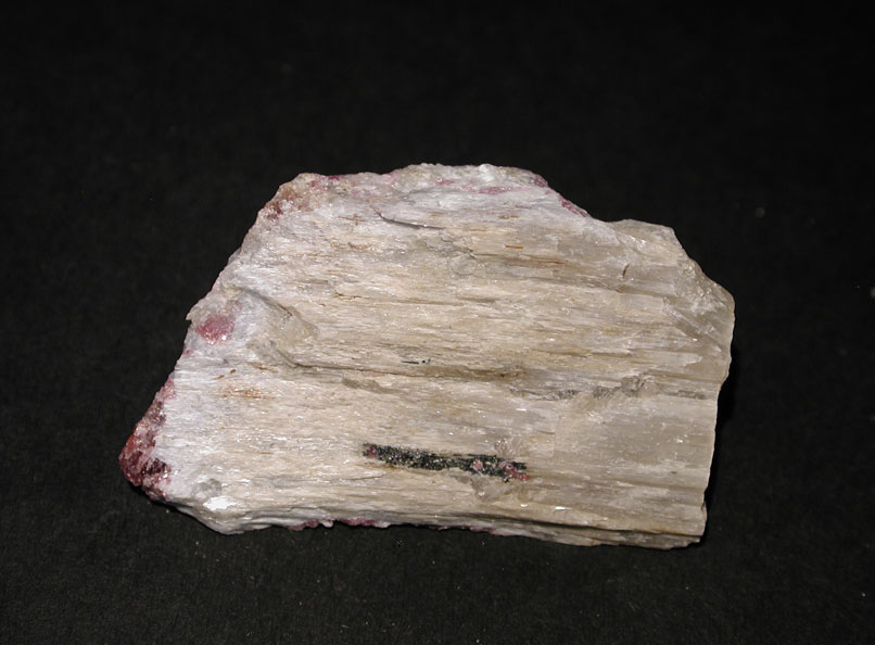 ナトリウム、カルシウムにフッ素を含んだ珪酸塩鉱物、アグレル石です。無色〜ベージュ色のファイバー状集合体をなし、赤色のユージアル石を共なって産出しています。