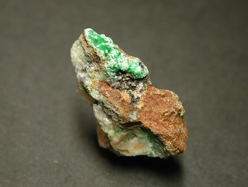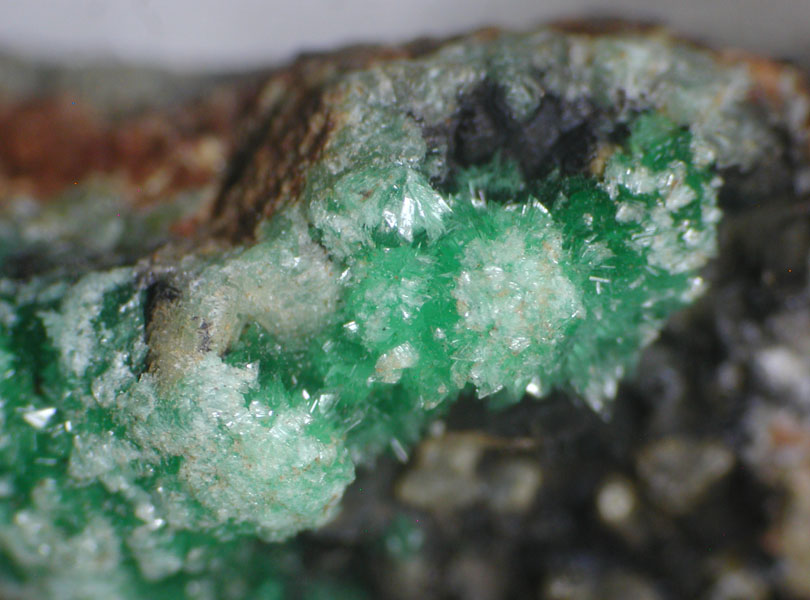 ニッケルの含水砒酸塩鉱物、ニッケル華です。末端が斜めに切れた、明るいグリーンの板状結晶が母岩の空隙に集合体をなしています。