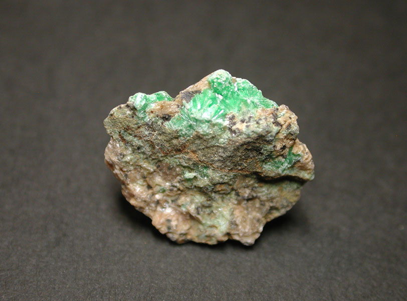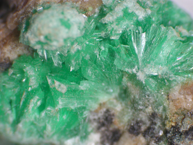 ニッケルの含水砒酸塩鉱物、ニッケル華です。末端が斜めに切れた、明るいグリーンの板状結晶が母岩の空隙に集合体をなしています。