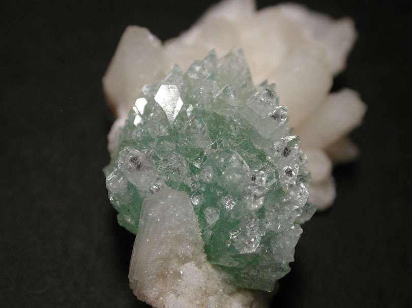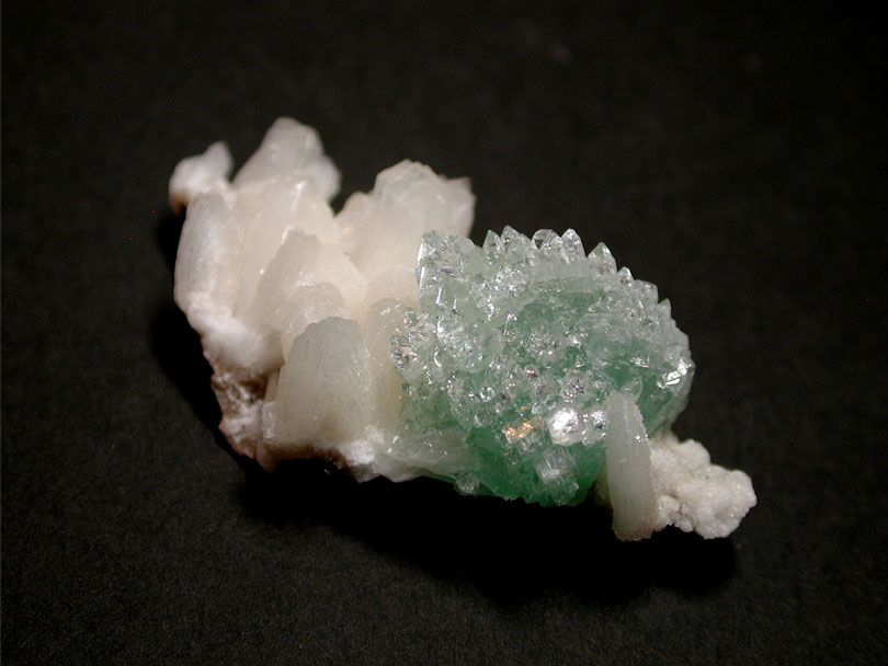 束沸石上にグリーンの犬牙状結晶が集合体をなして産出した、インド産のグリーンアポフィライトです。
