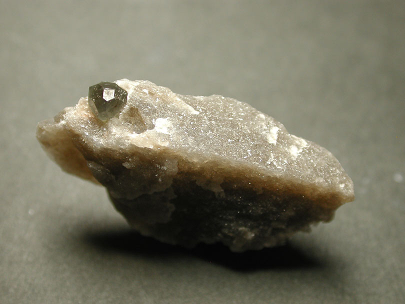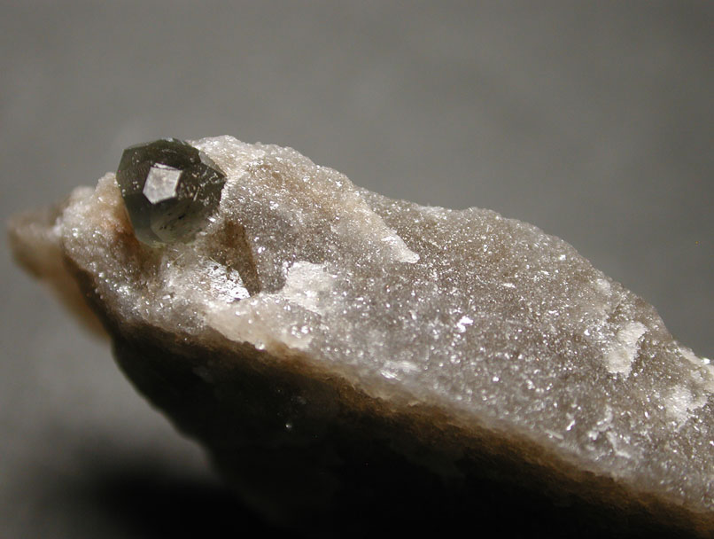 マグネシウム、硼酸、塩素の鉱物、ボラサイトです。このドイツ産の標本は、岩塩中に、暗灰緑色の多面体結晶で産出します。強い光源下で観察すると、透明感があるのが分かります。