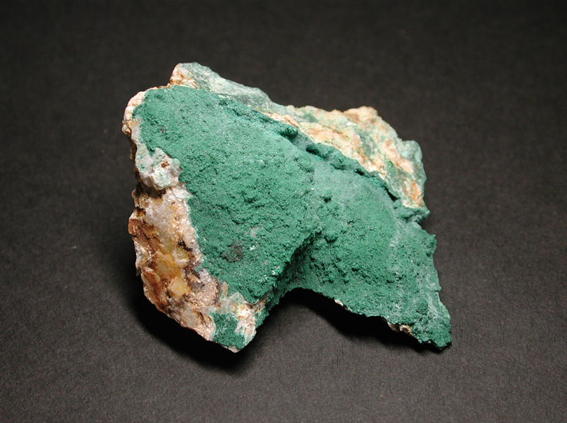 アイルランドから産出した、ハロゲン化鉱物に分類される銅と塩素の鉱物、ボタラック石です。濃緑色の本鉱が、母岩をびっしりと被っています。