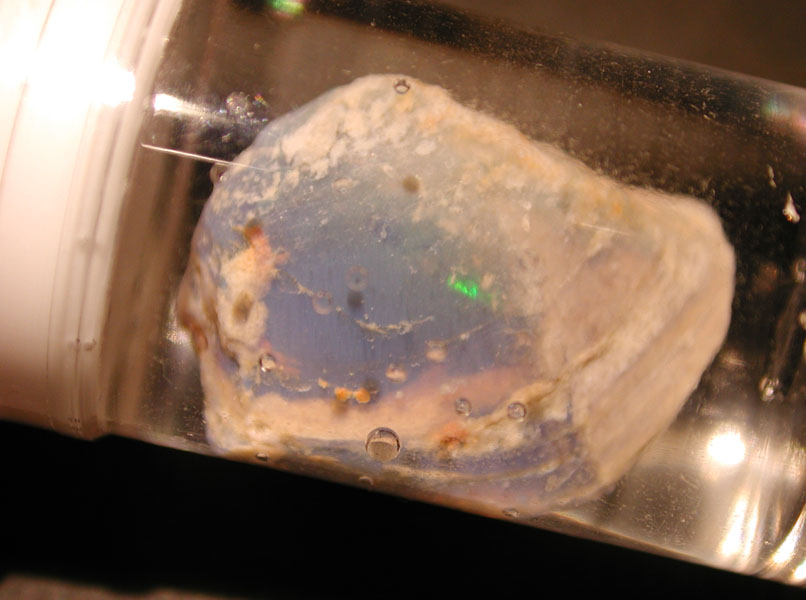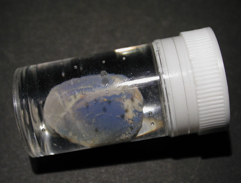 オーストラリア、Coober Pedy産の二枚貝オパールです。灰青色をしているもので、高品質な品ではありませんが、水中では、一部に僅かながら遊色も見られます。透明プラスティック製 (43mm x 12mm)の瓶に水中保存してありますが、水が無くなってきたり、汚れてきたら、蓋を開けて水を取りかえて下さい。