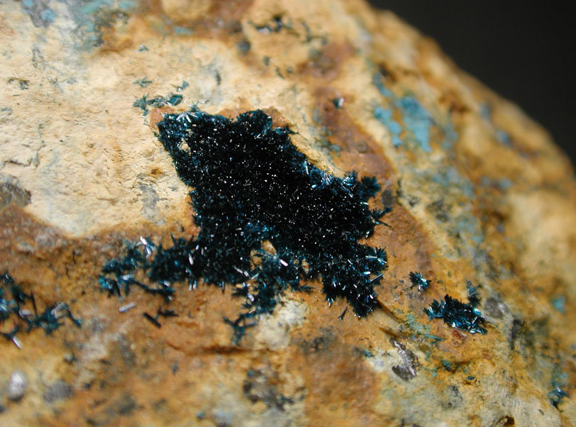 独特のピーコックブルーが美しい、ネバダ州産の斜開銅鉱です。8センチ大の母岩の所々に結晶集合体部が観察出来ます。