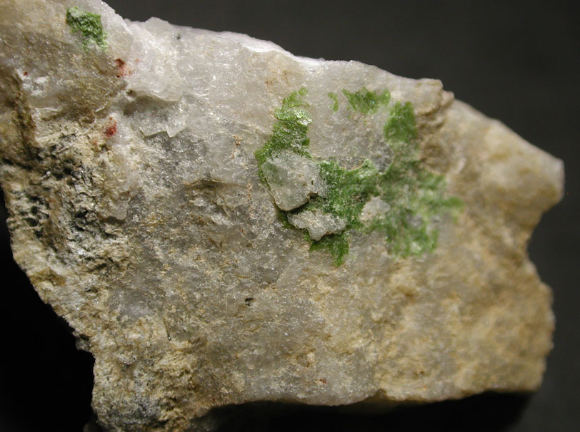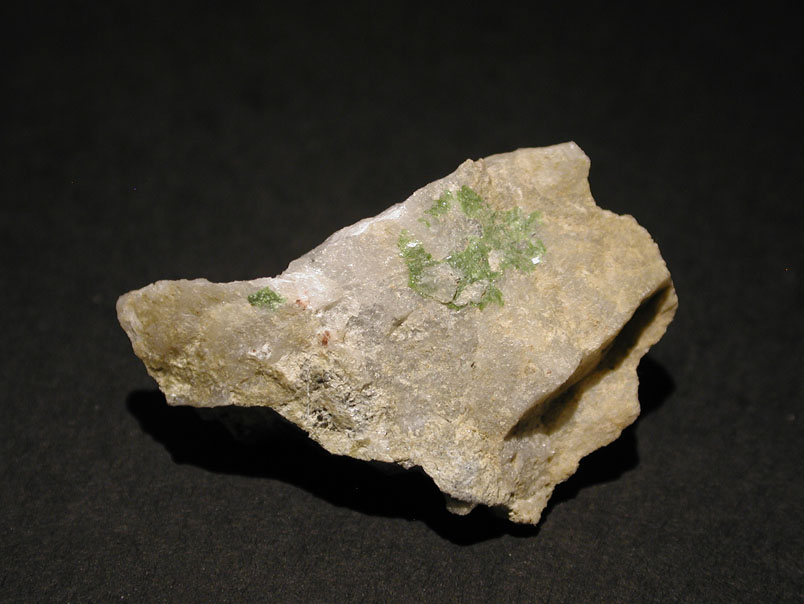銅のモリブデン酸鉱物、リンドグレン石です。光沢のあるグリーンの本鉱が、母岩上に張り付いています。