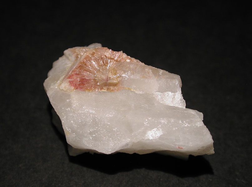 ペルー産のピンク色をした緑簾石。針状結晶の集合体が、石英中に入っているもの。