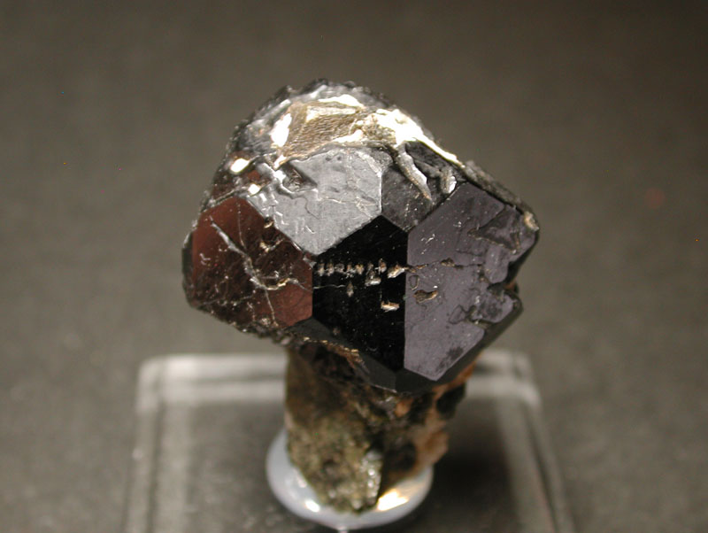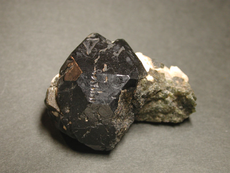 プレオナストと呼ばれるこの黒いスピネルは、苦土スピネル (Mg Al2 O4)と鉄スピネル (Fe Al2 O4)の中間種にあたるもので、(Mg,Fe)Al2 O4という組成を持ったスピネルです。立方体と八面体の集形など、多面体の結晶で産出する事が多く、特にこのロシア産のものはマニアの間で知られています。