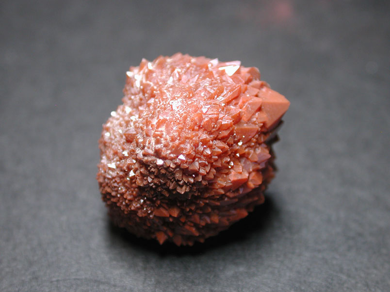 赤鉄鉱内包により赤く色付いた、スペイン、バレンシア産の赤水晶です。結晶が球状集合体をなす、面白い外観を持った標本です。