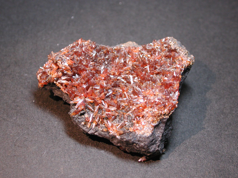 ガボン産の菱マンガン鉱です。濃赤色をした犬牙状結晶の集合体で、数十年前に産出したものですが、採掘者がかなりの期間ストックしていたため、陽の目をみたのは比較的最近で、所謂オールドストックとして出回り、一時期話題となりました。独特の色合いが印象的で立派な標本となっています。