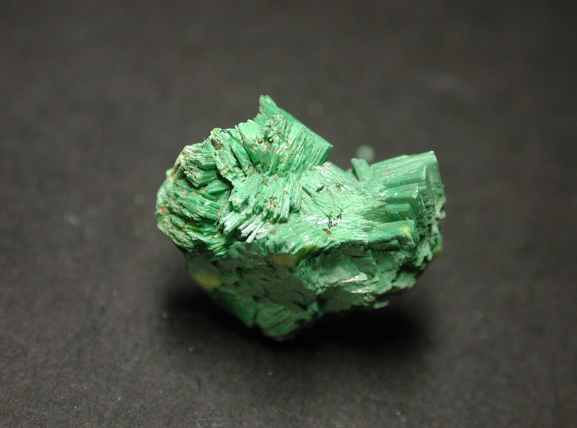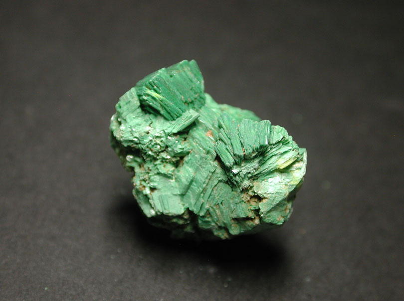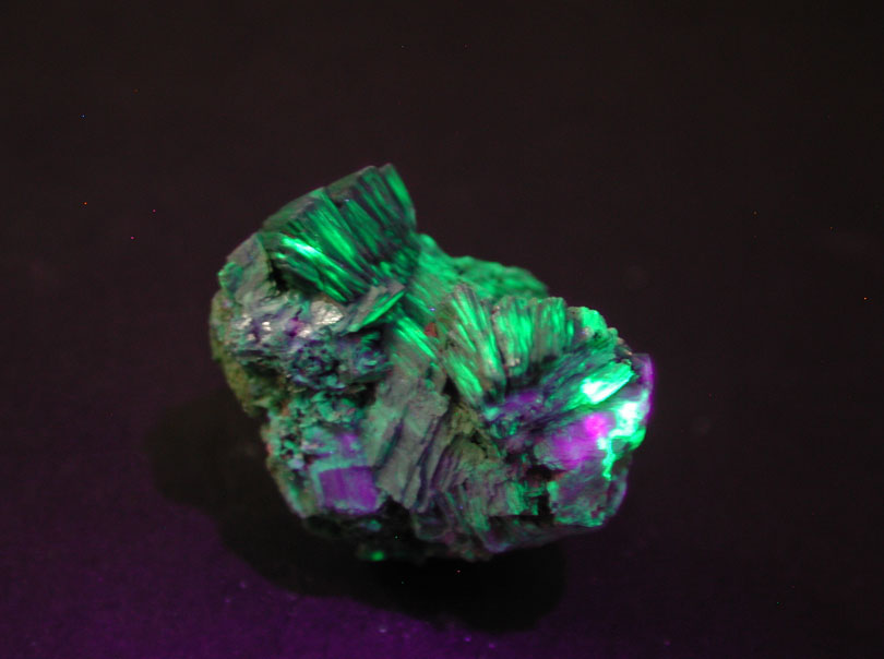 フランス、Aveyron産の燐銅ウラン鉱です。雲母状では無く、濃緑色の立派な結晶集合体で産出したもので、通常紫外線照射下で蛍光しない本鉱ですが、燐灰ウラン鉱の混入によるものか、本品は緑色の蛍光を発します。